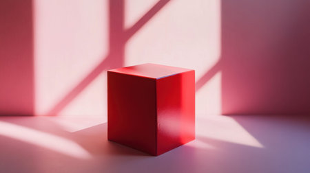 A striking red cube sits on a soft surface, casting shadows and creating a captivating interplay of light, perfect for modern art and design projects.