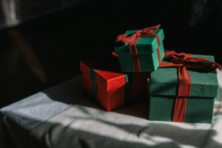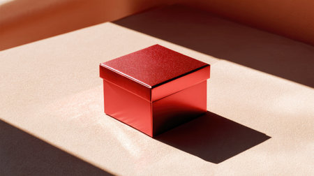 A striking red gift box sits elegantly on a soft textured surface, highlighted by a dynamic interplay of light and shadow, perfect for impactful visual presentations.