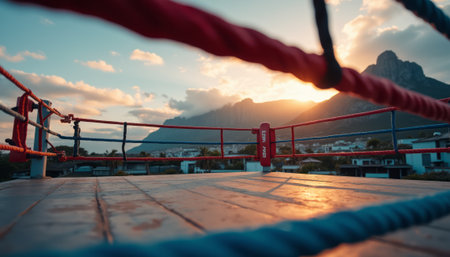 boxing ring is set under bright lights in a dimly lit arena. The red and blue ropes mark the space where fighters will soon compete. Reflections on the polished floor enhance the dramatic scene.