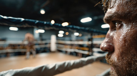 A close-up of a focused boxer showing intense determination in the ring, highlighting the sweat and effort during training, capturing the gym atmosphere.