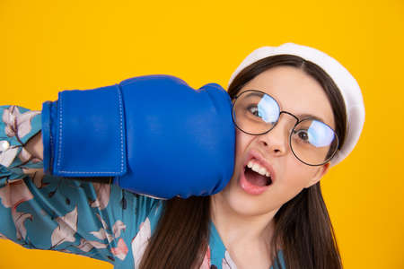 Funny face. Fun portrait of girl child in boxing gloves with punching face.