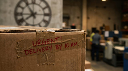 A drop shipping store box clock logistic concept. urgent shipping box store clock logistic drop delivery deadline in busy warehouse