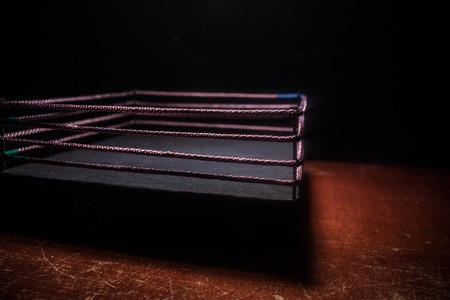 Empty boxing ring with red ropes for match in the stadium arena. Creative artwork decoration. Foggy background with light. Selective focus