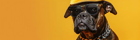 Dog in gold cap, sunglasses, chain, orange background, cool and stylish