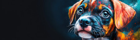 Colorfully painted puppy, with a mix of bright paint splashes against a dark background