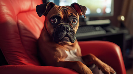 A brown pug sits comfortably in a red chair staring intently with wide eyes surrounded by a cozy indoor setting.