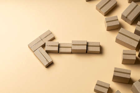 Arrow pointing to the left from cardboard boxes on a light brown background