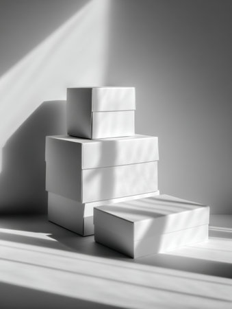 In a minimalist white studio, neatly stacked packaging boxes cast shadows on the surface, highlighting their clean lines and forms as light filters through.