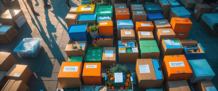 Top view of neatly arranged donation boxes containing food, supplies, and essentials on a paved outdoor area. Shadows of people visible in the background.