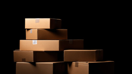 A visually striking arrangement of stacked cardboard boxes on a deep black background. This image conveys themes of shipping, storage, and commerce, making it versatile for various business-related projects.