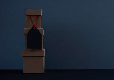Boxes in craft paper with twine closeup. Holiday concept. Front view.