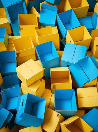 Stacked cardboard boxes against a colorful background of teal, yellow, and pink, highlighting a vibrant and organized storage solution, perfect for logistics and shipping themes.
