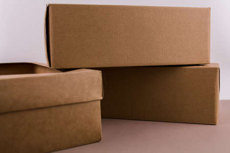 Paper boxes for storaging or transportation over light brown background with copy space. Sustainable packaging concept. Parcel delivery and packing service