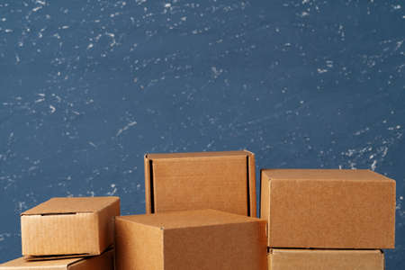 Packaged goods or parcels are stacked on the table. Clean space for text. Delivery by mail, courier service, through the point of issue, online store or warehouse.