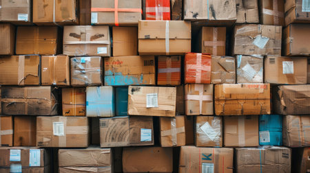 Cardboard boxes with shipping labels are stacked and awaiting shipment and delivery