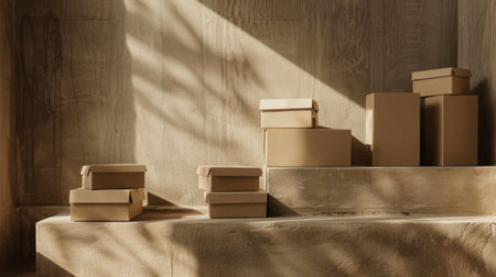 Sunlit shadows dance on a group of neatly stacked cardboard boxes, creating an intriguing interplay of light and texture. Experience a moment of simplicity and elegance. Generated AI