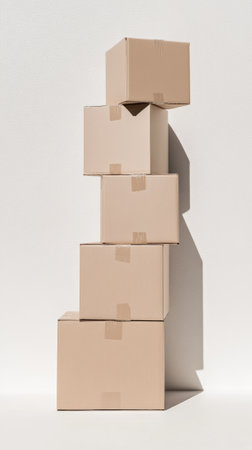 Five cardboard boxes taped and stacked high against a white wall casting a shadow, creating a precarious still life symbolizing shipping, storage, or moving