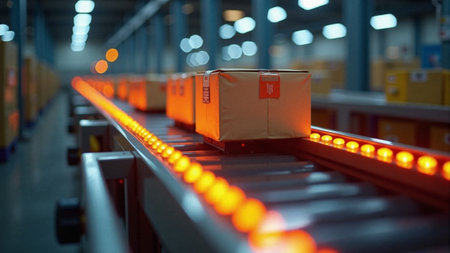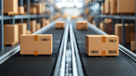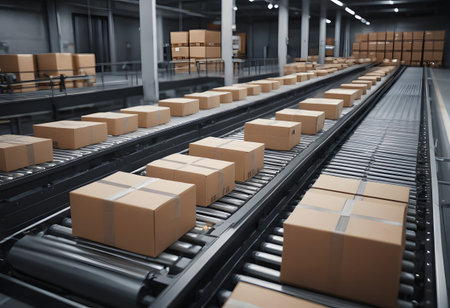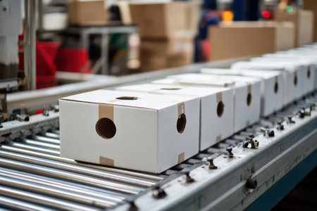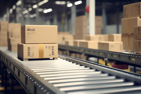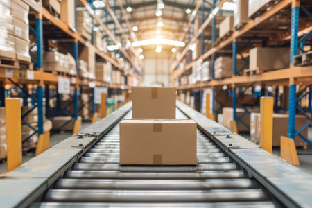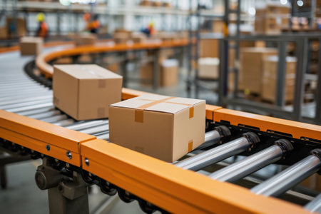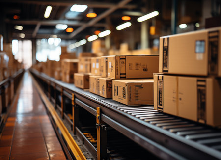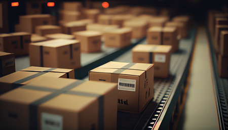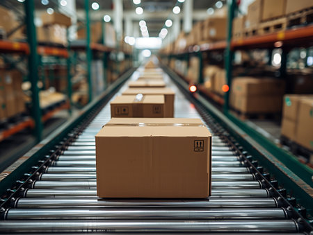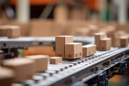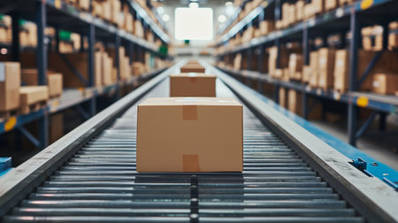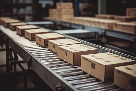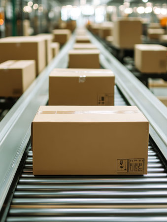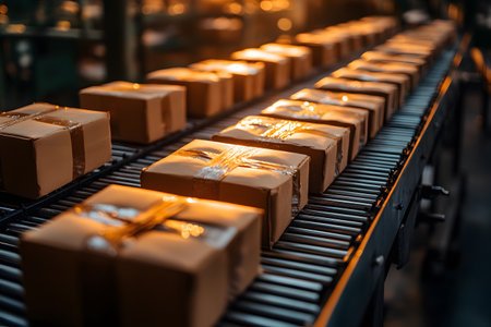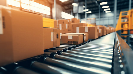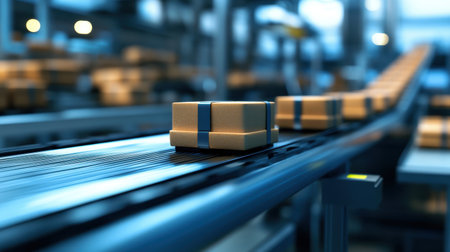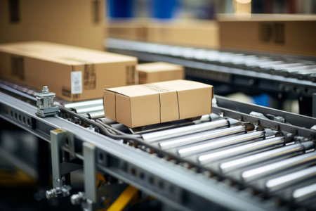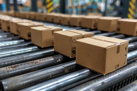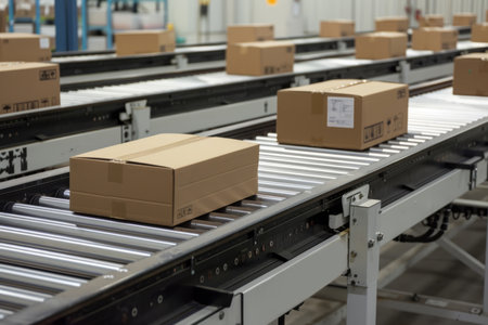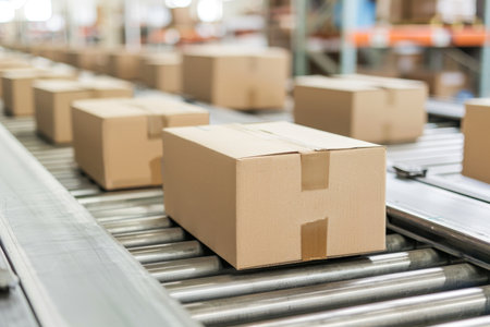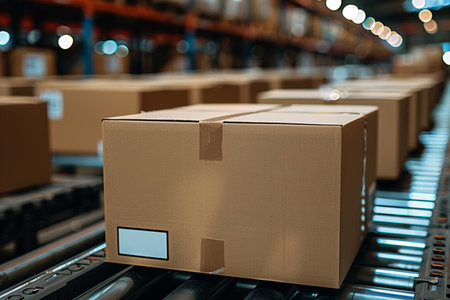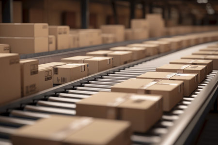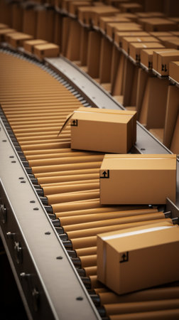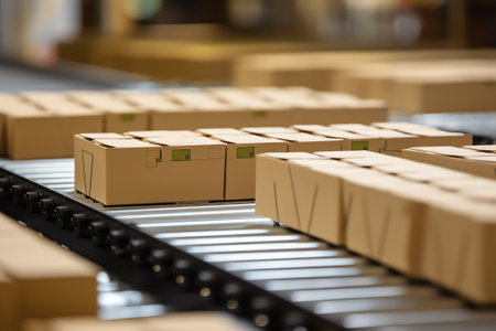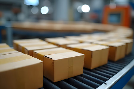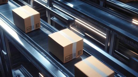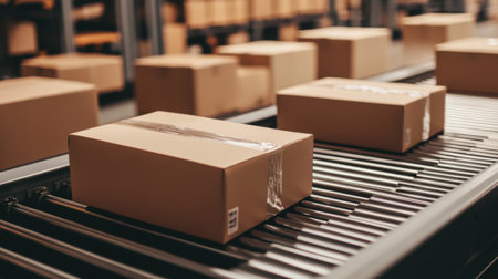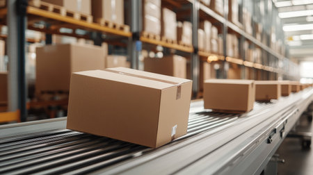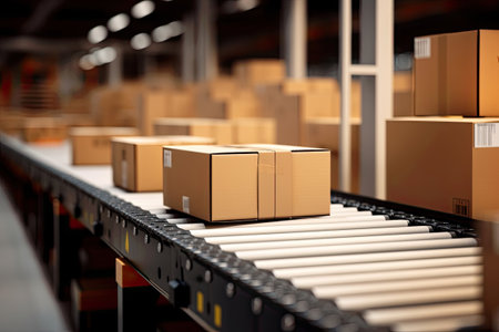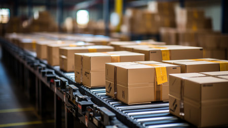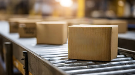 Cardboard boxes moving in row on automated production line, highlighting modern warehouse operations and industrial automation