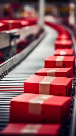 A close-up view of packages moving along a conveyor belt in a warehouse, showcasing modern logistics and streamlined operations for efficient delivery and transportation solutions.