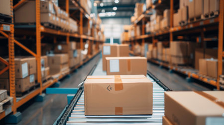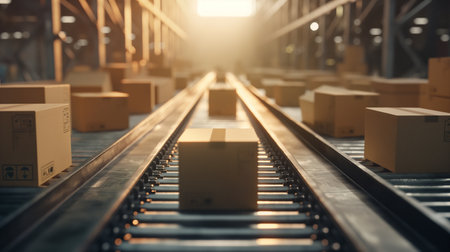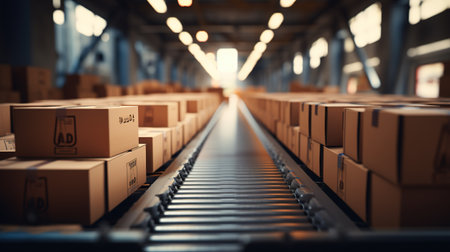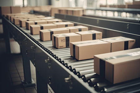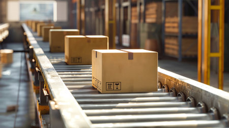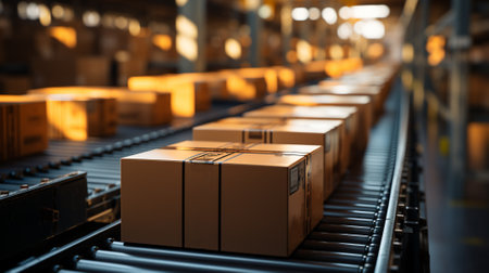 AI Generated. Brown paper boxes arranged on a conveyor belt in a modern warehouse setting with soft lighting
