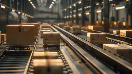 This image showcases cardboard boxes moving along an industrial conveyor belt in a modern warehouse. It represents logistics, shipping, and efficient supply chain processes.