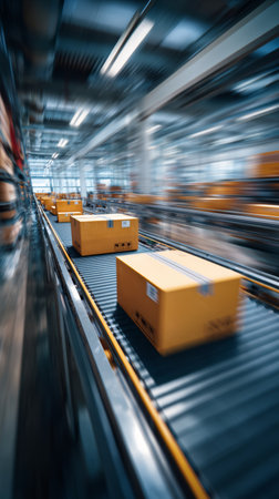 Fast delivery shipping box conveyor warehouse logistics motion blur distribution industrial supply chain packaging rush thrills
