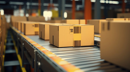 Realistic 3D illustration of cardboard boxes on a conveyor belt. Al generated