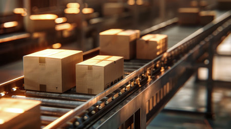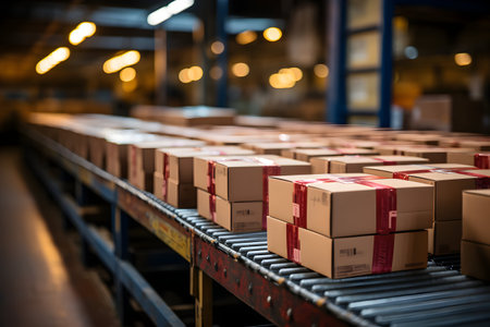 A row of neatly packed boxes moves along a conveyor belt, illuminated by warm lighting, symbolizing efficiency in logistics and industrial automation. ideal for illustrating manufacturing and supply chain processes. Generative AI