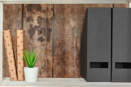 Colored folders for office files and paper on a shelf. Background image