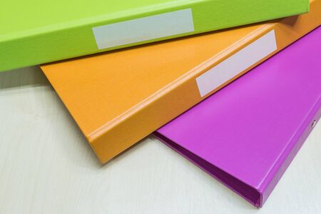 Closeup group of colorful document file on wood desk background