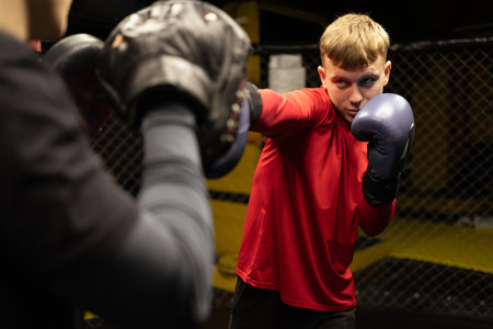Dynamic kickboxing practice with young focused Indian male boxer. intense young kickboxer training