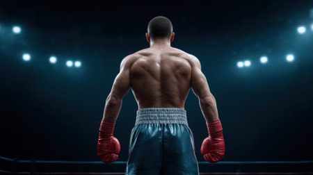A powerful boxer stands confidently in the ring, facing the arena lights, embodying strength and determination. Perfect for motivational themes in sports.