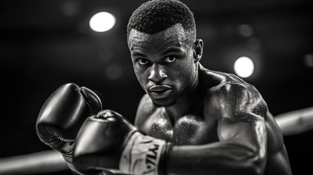 Fierce focus: A boxing fighter in the ring, displaying intensity and determination, ready for the next round