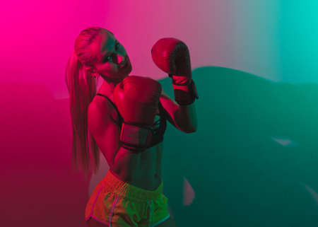 Fit woman boxer in boxing gloves in pink green neon light