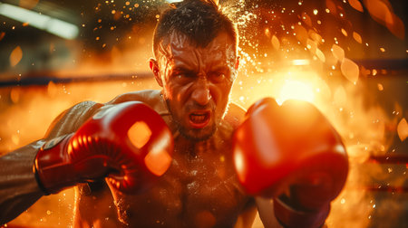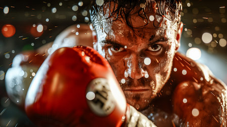 Muscular boxer with intense expression wearing boxing gloves and sweating heavily