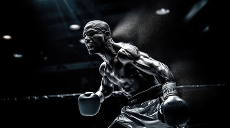 An intense black male boxer in action, showcasing strength and determination as he wins the match, surrounded by dramatic lighting and sweat droplets.
