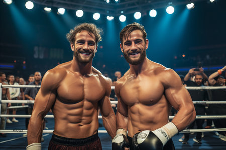 Two men in a boxing ring stand next to each other, ready for a match, A professional boxing match under the bright lights, AI Generated