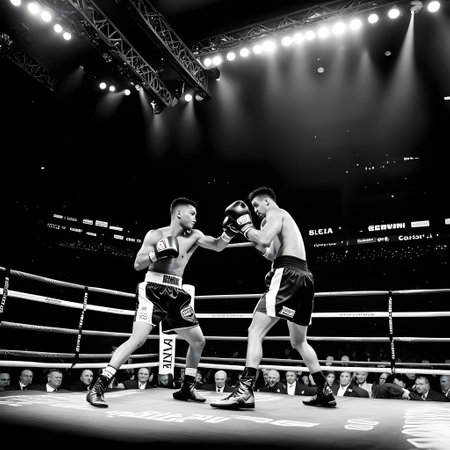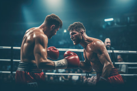 Two professional boxers facing off in the ring, each determined to claim victory in front of a packed stadiumThe intense atmosphere is heightened by the glare of the bright lights, casting dramatic shadows as the fighters exchange powerful blows
