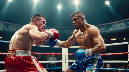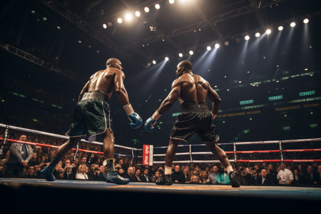 On the large arena, two professional boxers are engaged in battle using Generative AI.