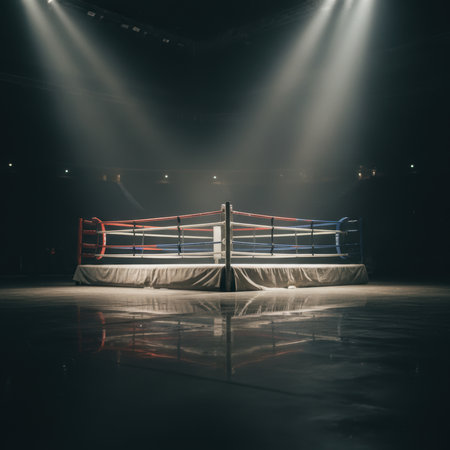 Epic empty boxing ring in the spotlight on the fight night AI