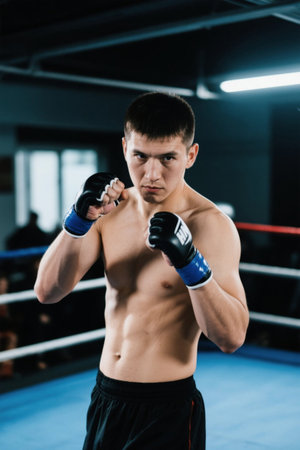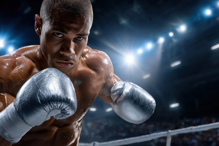 Focused male boxer in a ring, depicting strength and intensity in boxing.