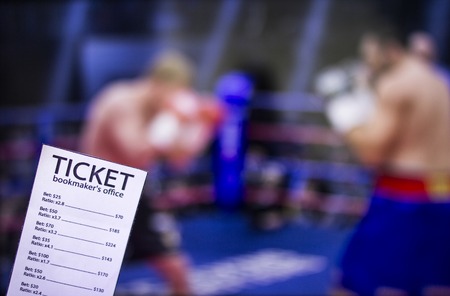 Bookmaker ticket on the background of the TV on which show boxing, sports betting, pugilism