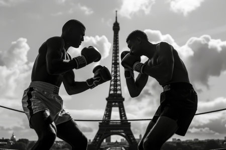 Boxers fighting, Eiffel Tower backdrop, monochrome.