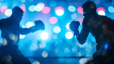 Defocused silhouettes of boxers their intense expressions and flying sweat frozen in time against a blurry backdrop of bright stadium lights.