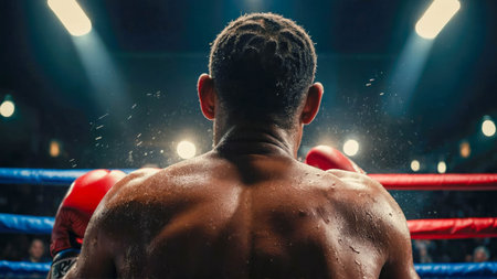 Rear view of African American boxer boxing in ring at night.