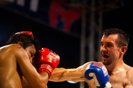 BANGKOK - OCTOBER 12: A solid punch to the head sends perspiration flying from a muay thai fighter at Fight Night October 12, 2010 at Bangkok, Thailand