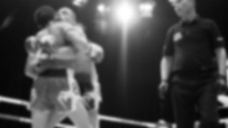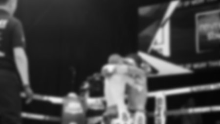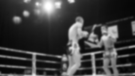 Blurred images black and white photo style of Thai boxing or Muay Thai or Kickboxing which local and foriegn boxer are fighting on the ring at indoor stage as martial art sport. Muay Thai Kick boxing