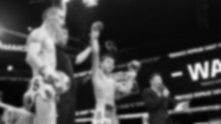 Two boxers in a ring mid-fight, with an audience in the background.