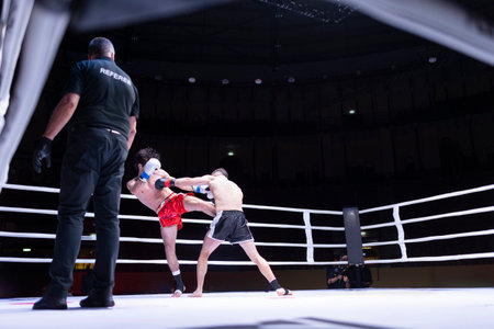 Zhytomyr, Ukraine - January 21, 2022: Two professional boxers fighting in the ring.