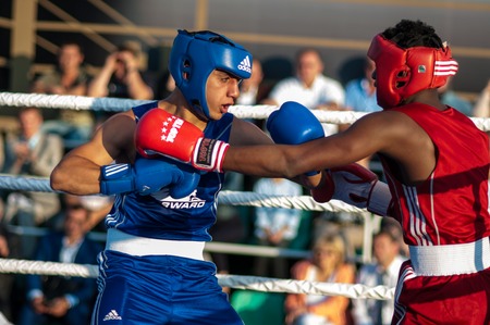 ORENBURG, ORENBURG region, RUSSIA, 25 July, 2014 year. Youth meeting on the boxing match between Russia and Cuba. A boxing match between Alayn Limonta (Cuba, Havana) and Gabil Mamedov (Russia, Orenburg)